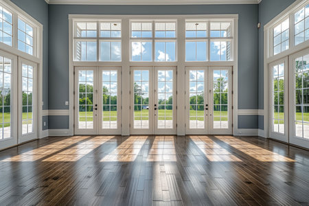 A spacious room features large windows and double doors that allow soft sunlight to illuminate the polished floor. The minimalist design enhances the bright and airy atmosphere.