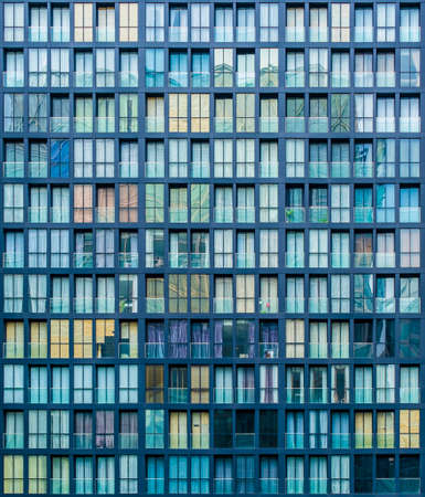 Close-up of many windows of a high-rise building with vertical dividing stripes. against the blue sky.