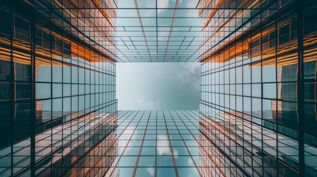 An upward perspective captures a contemporary skyscraper. The building features a glass facade reflecting the clear blue sky. This structure's composition showcases geometric patterns, highlighting the building's sleek design. Suitable for use in architecture, business, or urban development content, this imagery is adaptable for various commercial applications.