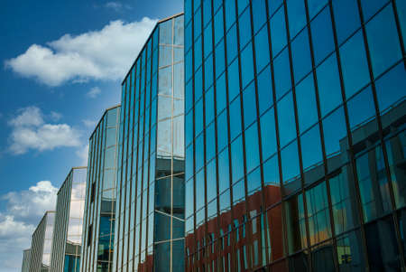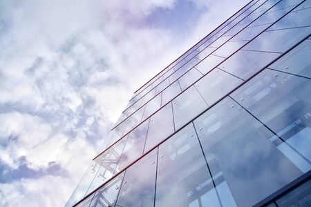 Modern glass facade of an office building, reflection of the sky in the Windows.
