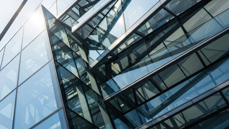 A striking view of a modern building's glass facade, showcasing reflective materials and innovative design. Ideal for urban architecture themes.