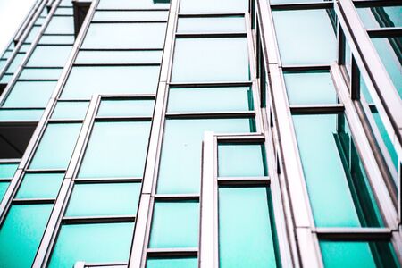 Abstract closeup of the glass-clad facade of a modern building covered in reflective plate glass. Architecture abstract background. Glass wall and facade detail. Velvia graphic filter.