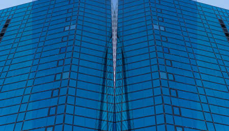 Background texture of modern business skyscraper building glass windows pattern with reflection over cloudy blue sky, low angle view