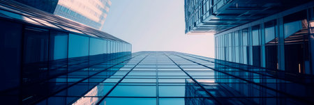 Low angle view of skyscraper with glass windows and blue sky background for business and finance concept. AI Generated
