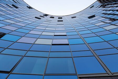 Bottom view of blue glass surface of semicircle building front wall reflecting blue sky. Few windows are opened
