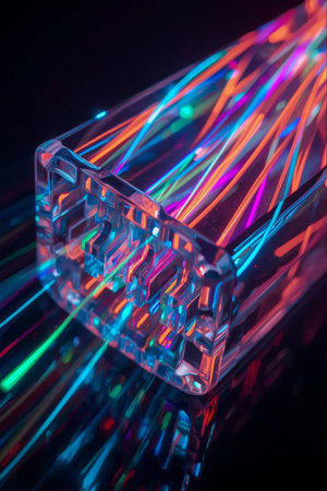 Transparent RJ45 connector surrounded by glowing fiber optic cables in vibrant colors. Highlights modern data transmission and connectivity. Ideal for tech, networking, and telecommunications visuals.