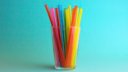Colorful drinking straws in a glass tumbler, with the vibrant hues contrasting against the background.