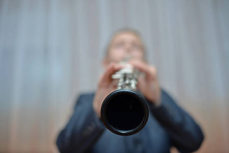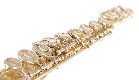 Detail of female fingers on flute keys with copy space and soft pastel background