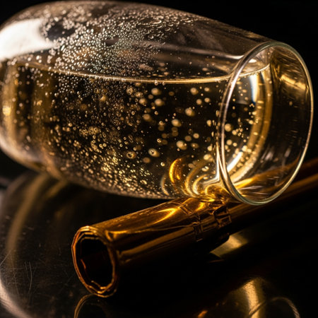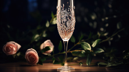 A champagne glass is filled with bubbles and is sitting on a table. The bubbles are rising to the top of the glass, creating a festive and celebratory atmosphere