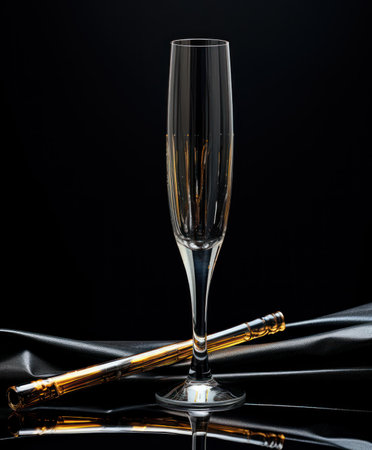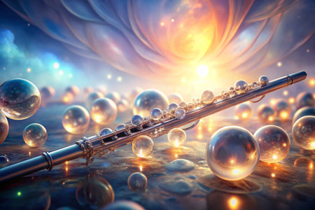 Flute rests among glass orbs, surreal glowing backdrop with ethereal atmosphere