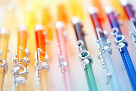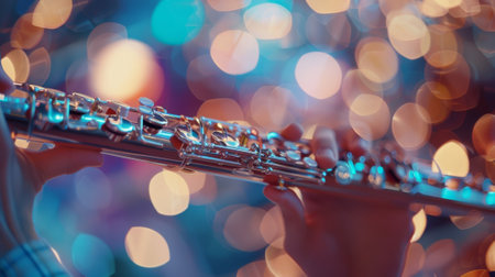A silver flute is showcased prominently, with musical notes appearing around it, creating a dynamic atmosphere that reflects the joy of music amidst vibrant colors.