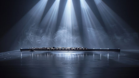 golden flute lies elegantly on top of a piece of polished wood, awaiting the touch of a musicians hand to create enchanting melodies.