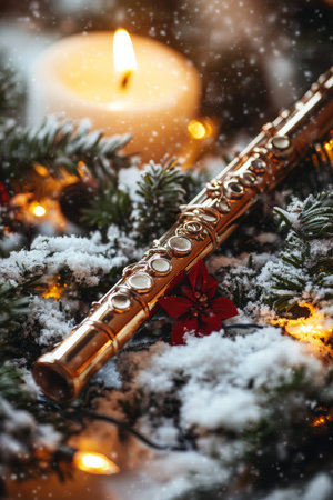 A delicate flute rests in soft, white snow, softly illuminated by the warm glow of a candle in the background, evoking a tranquil winter scene.