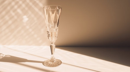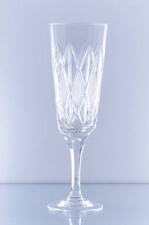 Cut glass crystal stemware champagne flute, isolated on shiny gray surface with gray background.