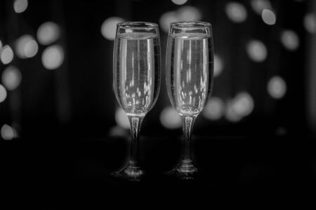 Champagne glass with sparkling wine and fireworks on background, closeup