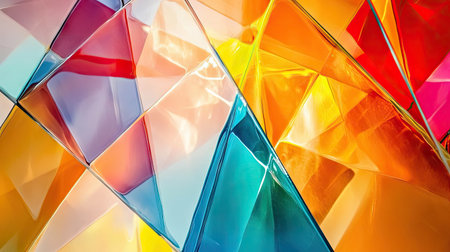 A vibrant abstract artwork featuring a mosaic of colorful geometric shapes in shades of green, gold, and orange.