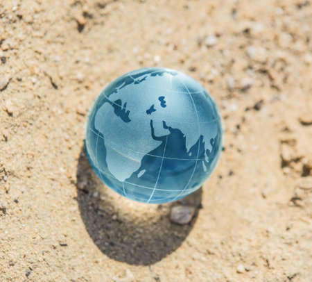 A stunning glass globe showcasing a detailed view of Earth, beautifully placed on a bed of fine sand. This image symbolizes the fragility of our planet and the importance of environmental awareness