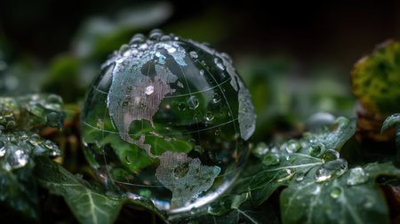 Crystal globe rests on lush green leaves, adorned with droplets of water, symbolizing connection between nature and planet. intricate details of globe reflect commitment to environmental awareness