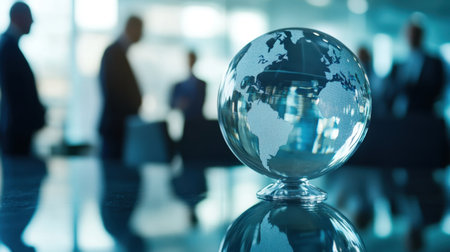 This image features a crystal globe resting on a table, surrounded by blurred silhouettes of business people, emphasizing the theme of global connections and professional collaboration.