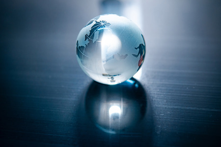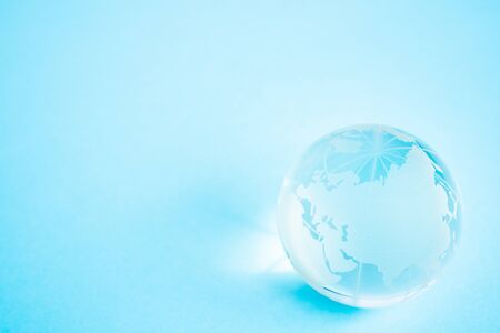World globe crystal glass reflect on blue glossy table. Global business and economy. Environmental conservation or ecology concept