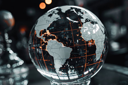Glowing glass sphere with earth outline symbolizing global connectivity and digital innovation