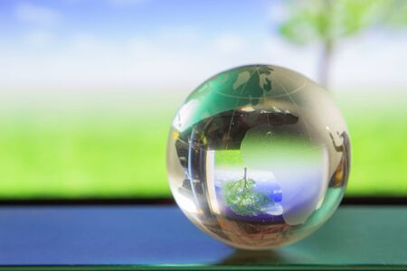 World globe crystal glass reflect in green wide grassland, tree and blue sky with clouds gloss on table beside the window. Global business and economy. Environmental conservation or ecology concept.