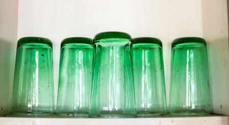 Clean water in a green glass on a white wooden table top view / ecological drink
