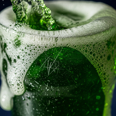 Extreme macro shot of green beer splashing over the rim of a dusty pint glass in harsh sunlight.