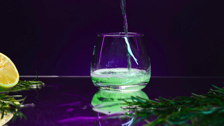 Green sparkling water into a glass on dark bokeh background. Square photo, selective focus, abstract background