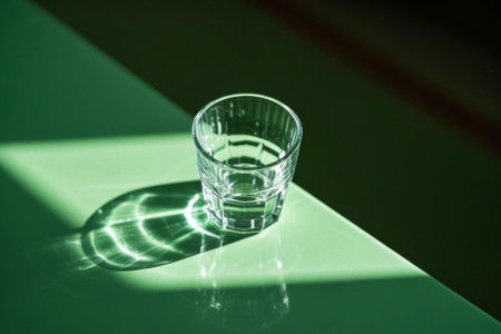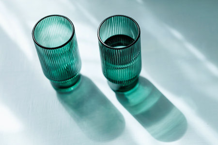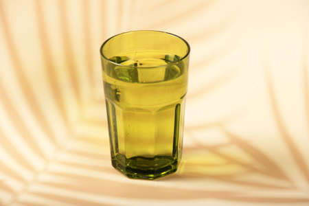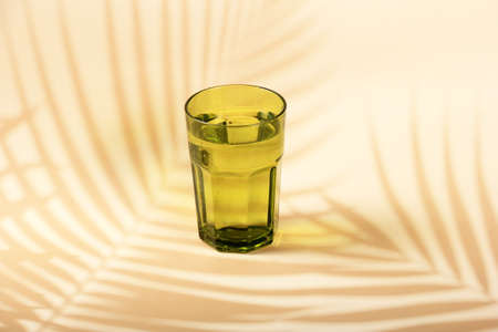 Green glass with water and a light background with plant leaves. Top view green glass of water with sunlight long shadow and refraction patterns and palm leaf trendy shadow