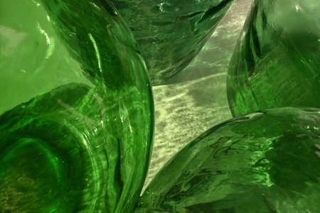 Abstract Detail Green Glass Demijohns Blue Sky. Big Bottles. Reflections and flashes of water drops.