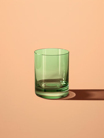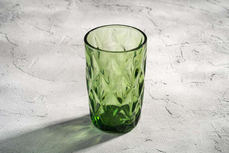 Green glass geometric cup with colorful shadow light rays on stone concrete background, angle view