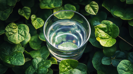 A clear glass filled with water surrounded by vibrant green leaves, capturing the essence of nature
