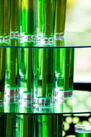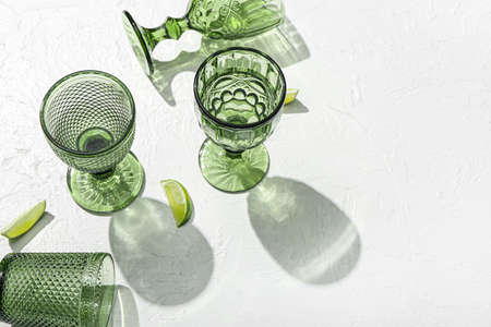 Refreshing summer drinks in crystal glasses on green bar tile background reflection harsh shadow. Cold gin vodka cocktail for hot summer day. Non alcoholic soda clear water mint tonic. Party vacation