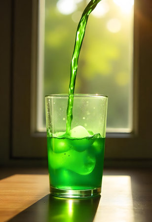 Green liquid being poured into a glass with ice cubes on a wooden table, illuminated by sunlight through a window. Refreshing drink.