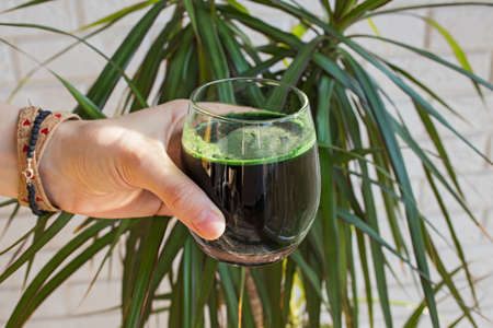 Womans hand holding green drink in a glass. Spirulina, chlorella or green smoothie.