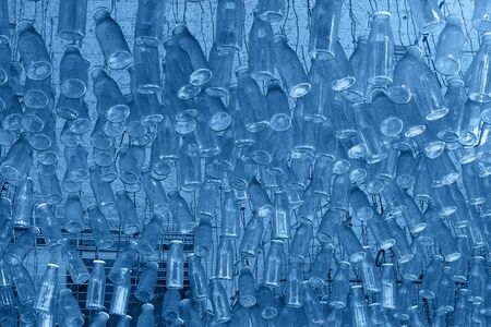 Milk or juice bottles suspended from the ceiling as a background. Trendy color of the year 2020.