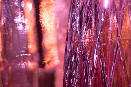 Glass vase with a grooved surface in the glare of light, bright background with changed color
