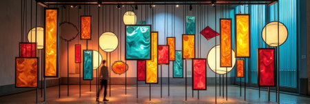 Vibrant stained glass in modern art gallery illuminated colorful designs. That the image is generated using AI.