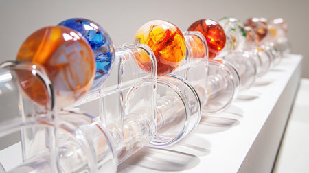 Stunning arrangement of colorful glass marbles in transparent plastic tubes, showcasing artistic design with vibrant colors and intricate patterns, ideal for decoration.