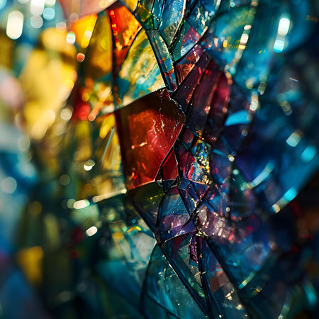 This vibrant abstract image showcases shattered glass fragments reflecting rich colors and dynamic light patterns. The interplay of transparency and sharp edges creates an intriguing visual texture, perfect for artistic and modern design projects.