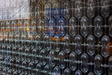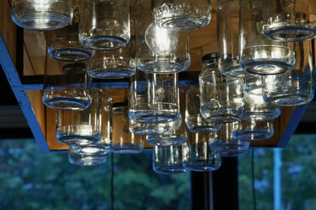 Empty glass glasses hanging from the ceiling of a cafe, close up