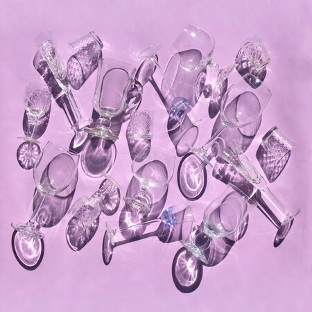 Empty glasses of different forms for wine, whiskey, mulled wine, vodka, liquor lie on pink background in sunlight with shadows. Minimal style pattern. Art design. Top view, flat lay.