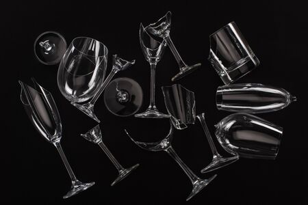 Top view of various dirty and with lime dots drinking glasses laid down on sides in black matte background