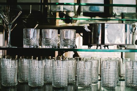 Party concept. Many clean washed glasses for strong drinks on the bar in the blue light. blurred image. ready for a party