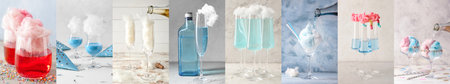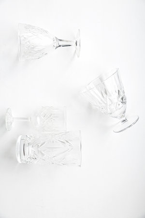 Empty glass goblets on a white background. Various crystal glasses and wine glasses, minimalistic flat lay with copy space