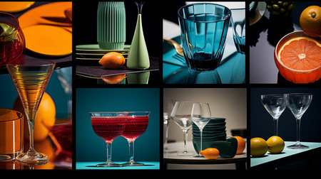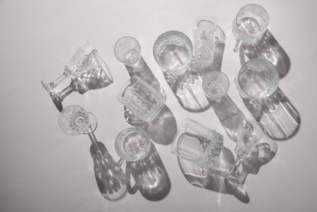 Beautiful different glasses stand on white background in sunlight and create shadows. Hard light, long shadows. Creative concept of drinks, alcohol cocktails. Glassware concept. Geometric shapes