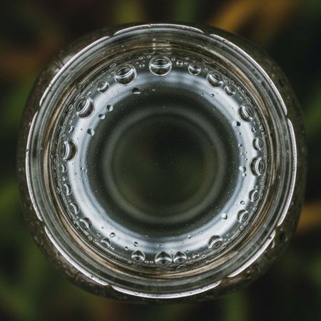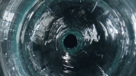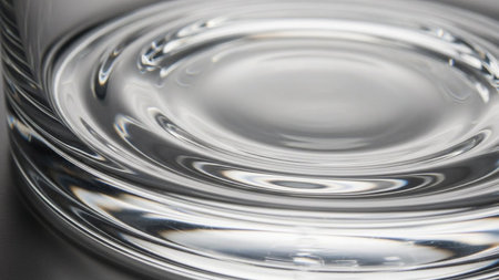 Concentric circles and ripples create an abstract pattern on the smooth surface of clear glass, reflecting light.