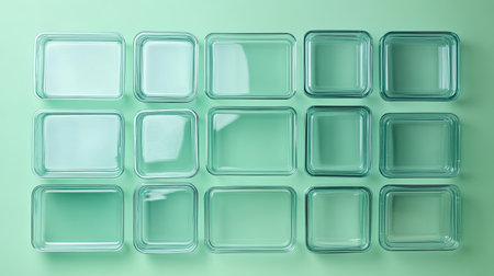 A flat lay image of various transparent glass containers on a green surface. The square shapes create a visually appealing arrangement, ideal for storage and organization.