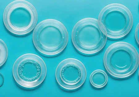 An assortment of clear glass petri dishes of various sizes are scattered on a white surface.